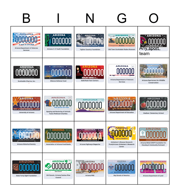 This bingo card has 28 images, a free space and 2 words: Any sport team and Any college plate.