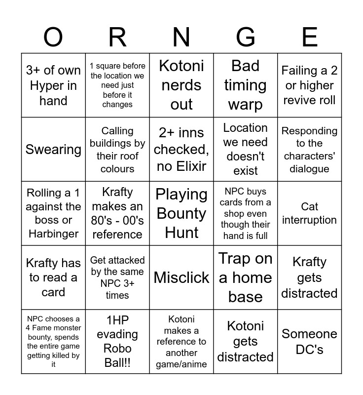 This bingo card has a free space and 24 words: Get attacked by the same NPC 3+ times, 1HP evading Robo Ball!!, 2+ inns checked, no Elixir, NPC chooses a 4 Fame monster bounty, spends the entire game getting killed by it, Failing a 2 or higher revive roll, 3+ of own Hyper in hand, Swearing, 1 square before the location we need just before it changes, NPC buys cards from a shop even though their hand is full, Misclick, Location we need doesn't exist, Rolling a 1 against the boss or Harbinger, Trap on a home base, Krafty gets distracted, Calling buildings by their roof colours, Kotoni gets distracted, Cat interruption, Kotoni nerds out, Responding to the characters' dialogue, Krafty makes an 80's - 00's reference, Someone DC's, Krafty has to read a card, Bad timing warp and Kotoni makes a reference to another game/anime.
