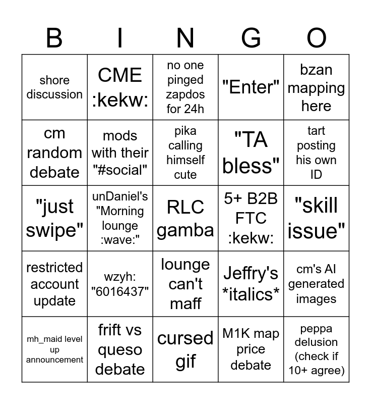 This bingo card has 61 words: cm poem of the day, frift vs queso debate, skinless fried chicken mention, restricted account update, M1K map price debate, new pin of shame, mods with their "#social", whales flexing portfolio, "TA bless", Bulwark complaint, "Enter", someone hosted GA, cm random debate, mod rig, "im poor", shore discussion, RLC gamba, bzan mapping here, "just UC", pika calling himself cute, 5+ B2B FTC :kekw:, no one pinged zapdos for 24h, mh_maid level up announcement, cm's AI generated images, KFDD complaints, "CR is 50/50", daily food talk, chips's "confused_cat", tart posting his own ID, UMR's ":jerry:", zod dysoning MP, Hiari using ugly emoji, clover bullied in lounge, lounge can't reading, CME :kekw:, ronza copium, whales mirroring whales, unDaniel's "Morning lounge :wave:", cat GIFs, "just swipe", random chinese idiom, wzyh: "6016437", "skill issue", hannad pong-ed a victim, Jeffry's *italics*, Squirtle's "uwu", Sien update whel list, lkb skin debate, beg for GA reroll, lounge can't maff, cursed gif, brey x mayday x monka, "why bingo look the same?", tamago delusion, coco enabling tamago delusion, "where today's bingo?", "why you guys 'insert emoji' me?", "rish get risher", "skye enabling tamago delusion", peppa delusion (check if 10+ agree) and "swiper no swiping" gif.