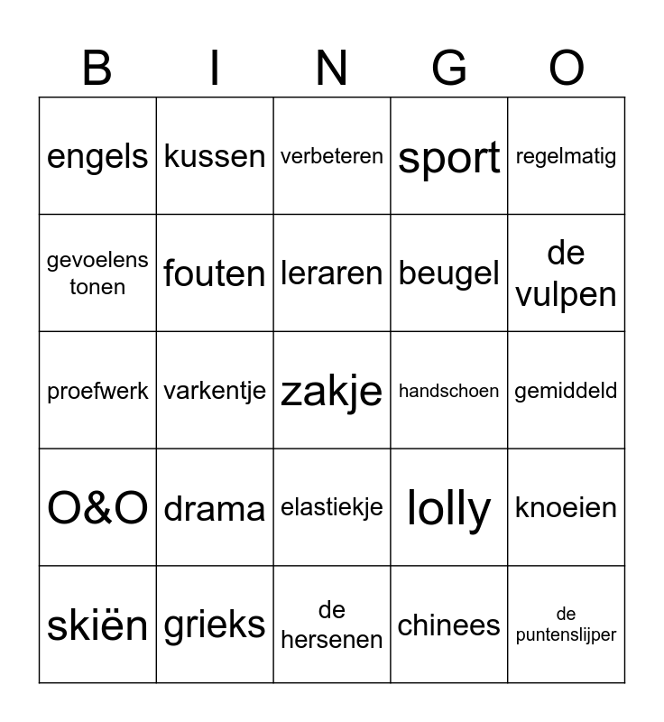 This bingo card has 80 words: rapport, slechte cijfers, verbeteren, probleemvakken, wiskunde, een tien, ouders, dom, verstoppen, moe, schreeuwen, ontspannen, sport, engels, plan, gevoelens tonen, erg, drama, voorbeeld, gemiddeld, strijden, regelmatig, proefwerk, leraren, fouten, werken, zwemmen, voetballen, spijbelen, de rekenmachine, de vulpen, de geodriehoek, de hersenen, de puntenslijper, skiën, handschoen, mok, muts, fiets, zakje, snoep, chocola, marker, ballet, luier, kussen, chromebook, horloge, oorbel, Nederlands elftal, knoeien, varkentje, lolly, euro, kaart, kunstgebit, krokodil, paard, paperclip, elastiekje, beugel, trein, vliegtuig, inkt, schrift, Frans, godsdienst, tekeken, geschiedenis, aardrijkskunde, O&O, grieks, latijn, natuurkunde, scheikunde, biologie, chinees, russisch, spaans and pizza.