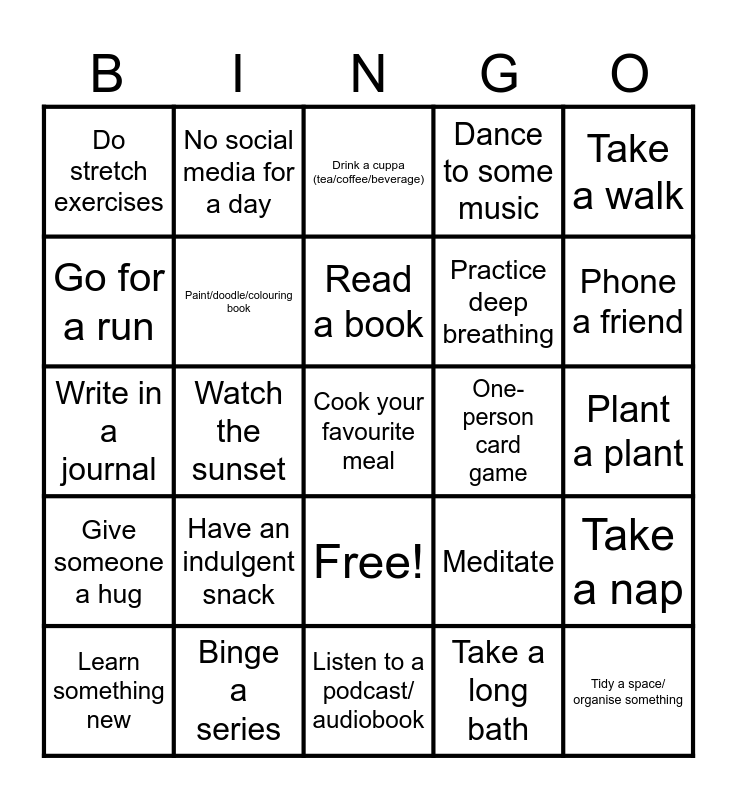 This bingo card has 26 words: Free!, Take a long bath, Read a book, Binge a series, Take a walk, Do stretch exercises, Go for a run, No social media for a day, Plant a plant, Meditate, Practice deep breathing, Write in a journal, Take a nap, Learn something new, Watch the sunset, Eat dessert first, Dance to some music, Give someone a hug, Drink a cuppa (tea/coffee/beverage), Cook your favourite meal, Phone a friend, Listen to a podcast/ audiobook, One-person card game, Have an indulgent snack, Paint/doodle/colouring book and Tidy a space/ organise something.