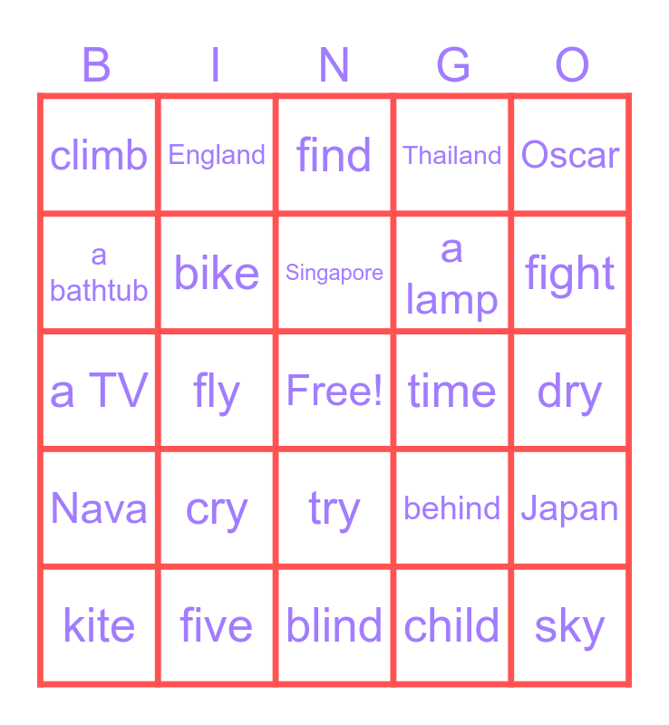 This bingo card has a free space and 29 words: kite, ride, fly, my, climb, find, bike, cry, time, five, dry, sky, blind, child, fight, light, try, Nava, Oscar, a TV, behind, next to, a lamp, a bathtub, Thailand, England, Japan, Singapore and Bangkok.