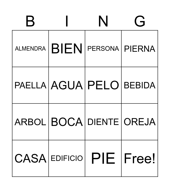 This bingo card has 23 words: Free!, ROJO, BEBIDA, ESCUELA, PAELLA, ALMENDRA, AGUA, BIEN, CASA, DEDO, BOCA, ARBOL, CAFE, ISLA, EDIFICIO, KILO, PERSONA, DIENTE, PELO, OREJA, PIERNA, PIE and ANIMAL.