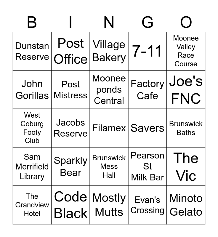 This bingo card has a free space and 39 words: St Joey's School, St Joey's Church, Mr Truongs, Post Mistress, The Grandview Hotel, Brunswick Mess Hall, Moonee ponds Central, Cornish Arms, Moonee Valley Race Course, Sam Merrifield Library, Jacobs Reserve, 7-11, Minoto Gelato, Brunswick Baths, Savers, Sparkly Bear, Don Bosco's, Dunstan Reserve, Denzel Don Playground, Pearson St Milk Bar, John Gorillas, Mostly Mutts, Factory Cafe, Joe's FNC, Con's FNC, Albion Pizza, Roy's on Melville, Super Rooster, Parkville Juvie, Post Office, 58 Tram, TAB, Village Bakery, Code Black, Evan's Crossing, Co Conspirators, The Vic, West Coburg Footy Club and Magic Dollar.
