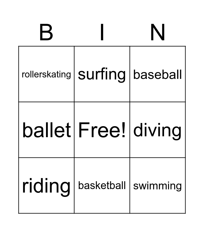 This bingo card has a free space and 11 words: football, basketball, swimming, riding, surfing, baseball, diving, karate, ballet, rollerskating and dancing.