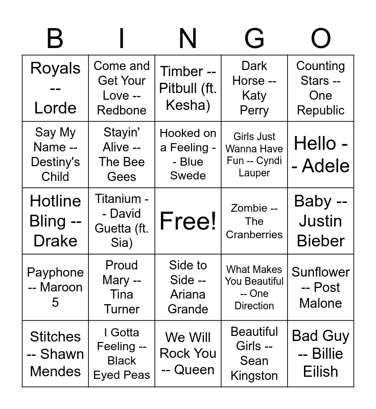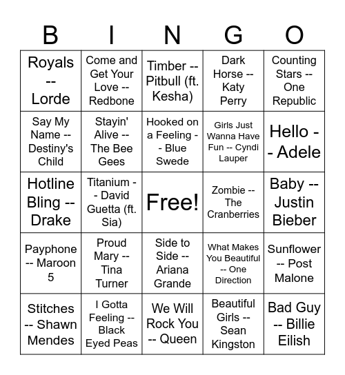 This bingo card has a free space and 34 words: Rude -- Magic!, Beautiful Girls -- Sean Kingston, Good 4 You -- Olivia Rodrigo, Somebody That I Used to Know -- Gotye, Payphone -- Maroon 5, Stayin' Alive -- The Bee Gees, Counting Stars -- One Republic, Stitches -- Shawn Mendes, Come and Get Your Love -- Redbone, Temperature -- Sean Paul, Hooked on a Feeling -- Blue Swede, Timber -- Pitbull (ft. Kesha), Despacito -- Luis Fonsi, Genie in a Bottle -- Christina Aguilera, Zombie -- The Cranberries, Hello -- Adele, I Gotta Feeling -- Black Eyed Peas, Hotline Bling -- Drake, Proud Mary -- Tina Turner, What Makes You Beautiful -- One Direction, Side to Side --Ariana Grande, Can't Feel My Face -- The Weeknd, Royals -- Lorde, Baby -- Justin Bieber, We Will Rock You -- Queen, Bad Guy -- Billie Eilish, Dark Horse -- Katy Perry, Cake by the Ocean -- DNCE, Girls Just Wanna Have Fun -- Cyndi Lauper, Say My Name -- Destiny's Child, Barbie Girl -- Aqua, Titanium -- David Guetta (ft. Sia), Sunflower -- Post Malone and New York New York -- Frank Sinatra.