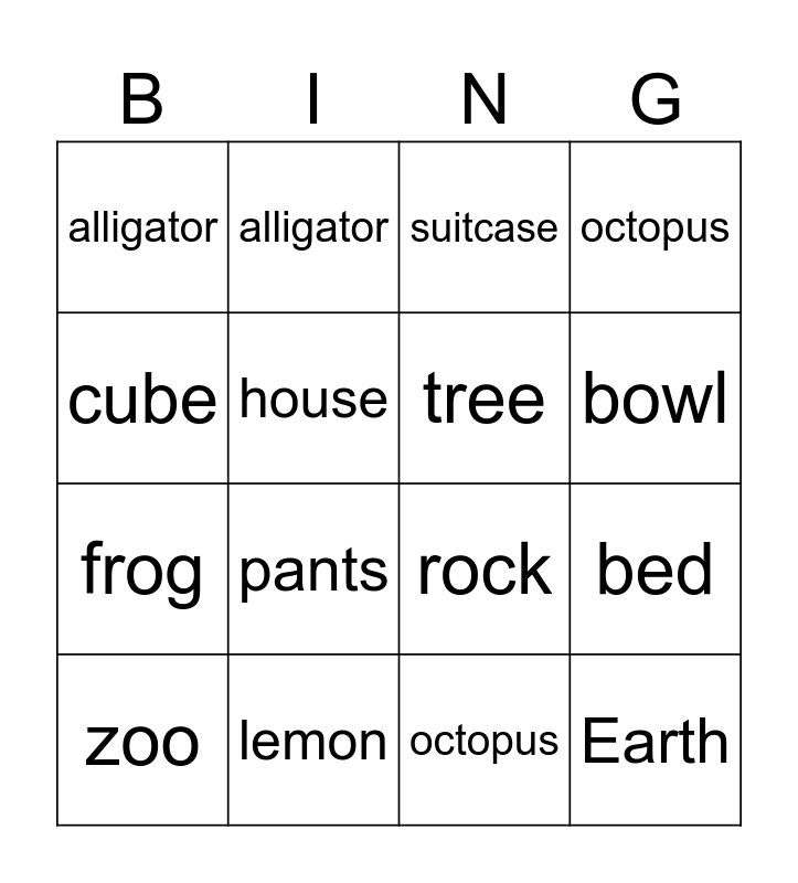 ⚠ This card has duplicate items: plant (2), coat (2), night (2), cat (2), music (2), flower (2), rock (3), bowl (2), camera (2), rain (3), zoo (3), ring (2), bird (2), banana (2), turtle (2), bunny (2), kitten (3), hair (3), jellyfish (2), bread (4), zigzag (2), corn (3), alive (3), basketball (2), bed (2), alligator (2), bus (3), cow (2), truck (3), star (3), lemon (3), feet (2), octopus (3), tail (2), dinosaur (2), bracelet (2), candle (2), knee (2), Mickey Mouse (2), Earth (2), snake (3), pants (3), purse (3)