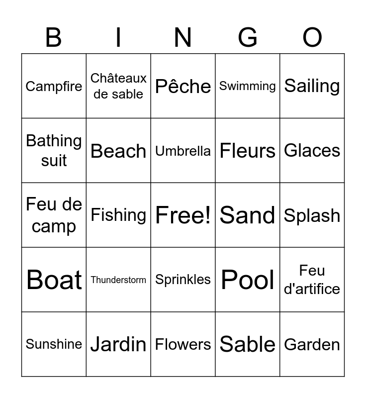 This bingo card has a free space and 39 words: Ice cream, Summer, Vacation, Beach, Sunshine, Sprinkles, Umbrella, Sandcastles, Sailing, Boat, Fishing, Swimming, Garden, Splash, Sand, Thunderstorm, Fireworks, Campfire, BBQ, Pool, Bathing suit, Flowers, Fleurs, Glaces, L'été, Les vacances, Plage, Soleil, Parapluie, Châteaux de sable, Voile, Bateau, Pêche, Jardin, Sable, Orage, Feu d'artifice, Feu de camp and Piscine.