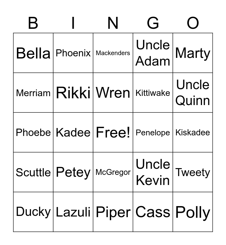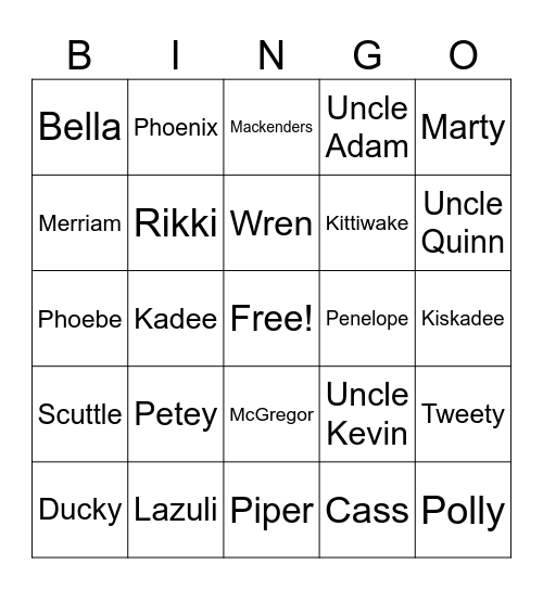 This bingo card has a free space and 36 words: Wilson, Lazuli, Goldie, Rikki, Uncle Kevin, Scuttle, Wren, Fox, Marty, Tross, Kadee, Uncle Adam, Jayhawk, Penelope, Uncle Quinn, Bella, Cucky, Petey, Polly, Mackenders, Kiskadee, Tweety, Lazuli, Ducky, Piper, Phoenix, Phoebe, Rufous, Kittiwake, Merriam, Chickadee, Dipper, Cass, McGregor, Lorikeet and Uncle Gene.