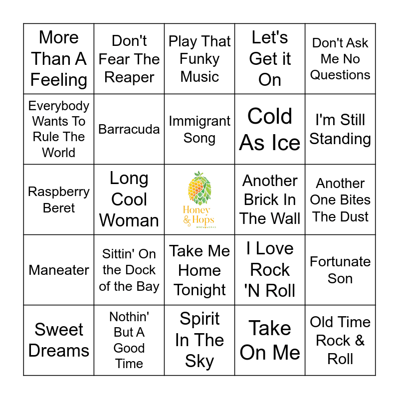 This bingo card has a free space and 46 words: Dancing Queen, Old Time Rock & Roll, Back In Black, Spirit In The Sky, Sittin' On the Dock of the Bay, Stayin Alive, Don't Fear The Reaper, You're The One That I Want, Everybody Wants To Rule The World, Nothing's Gonna Stop Us Now, Barracuda, Let's Get it On, Fortunate Son, I Love Rock 'N Roll, I Was Made For Lovin' You, Pour Some Sugar On Me, Immigrant Song, Another Brick In The Wall, Paint It, Black, Don't Ask Me No Questions, Long Cool Woman, Take On Me, More Than A Feeling, Cold As Ice, Livin' On A Prayer, I'm Still Standing, Sweet Dreams, Don't Stop Believin', Take Me Home Tonight, Maneater, Mony Mony, Billie Jean, Kashmir, Is This Love, Roxanne, Nothin' But A Good Time, Another One Bites The Dust, Walk This Way, Should I Stay or Should I Go, Edge of Seventeen, Your Love, Play That Funky Music, Raspberry Beret, Crazy Train, Do Ya Think I'm Sexy? and Missing You.