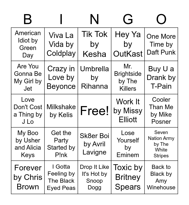 This bingo card has a free space and 48 words: Feel Good Inc by Gorillaz, Back to Black by Amy Winehouse, Poker Face by Lady Gaga, Drop It Like It's Hot by Snoop Dogg, Get the Party Started by P!nk, Use Somebody by Kings of Leon, Viva La Vida by Coldplay, Fallin' by Alicia Keys, Are You Gonna Be My Girl by Jet, Crazy by Gnarles Barkley, Crazy in Love by Beyonce, Hey Ya by OutKast, Seven Nation Army by The White Stripes, Lose Yourself by Eminem, Since U Been Gone by Kelly Clarkson, Cry Me A River by Justin Timberlake, Umbrella by Rihanna, Work It by Missy Elliott, Gold Digger by Kanye West, One More Time by Daft Punk, Milkshake by Kelis, Toxic by Britney Spears, American Idiot by Green Day, Mr. Brightside by The Killers, No Air by Jordin Sparks, Buy U a Drank by T-Pain, Forever by Chris Brown, Pocketful of Sunshine by Natasha Bedingfield, Sk8er Boi by Avril Lavigne, My Boo by Usher and Alicia Keys, When I Grow Up by Pussycat Dolls, Fergalicious by Fergie, Beautiful Girls by Sean Kingston, Beautiful by Cristina Aguilera, I Gotta Feeling by The Black Eyed Peas, I Don't Want to Be by Gavin DeGraw, Survivor by Destiny's Child, Cooler Than Me by Mike Posner, Incomplete by Backstreet Boys, One, Two Step by Ciara, Shake It by Metro Station, Bye Bye Bye by NSYNC, Tik Tok by Kesha, Teenage Dirtbag by Wheetus, Love Don't Cost a Thing by J Lo, I Know You Want Me by Pitbull, Drops of Jupiter by Train and Hips Don't Lie by Shakira.