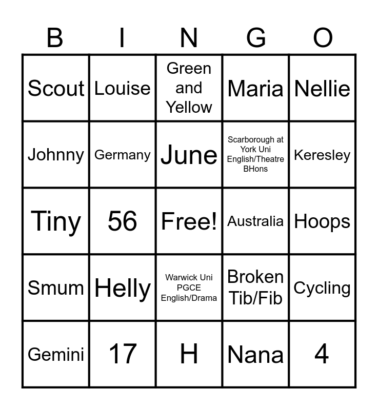 This bingo card has a free space and 24 words: Helly, 17, June, Gemini, Nellie, Scout, Johnny, Louise, Australia, Warwick Uni PGCE English/Drama, Scarborough at York Uni English/Theatre BHons, Tiny, Broken Tib/Fib, Cycling, Germany, Nana, Hoops, Green and Yellow, Keresley, 56, 4, Smum, Maria and H.