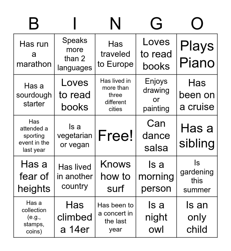 This bingo card has a free space and 24 words: Has lived in another country, Has climbed a 14er, Has lived in more than three different cities, Has a collection (e.g., stamps, coins), Plays Piano, Has run a marathon, Has a sourdough starter, Speaks more than 2 languages, Can dance salsa, Knows how to surf, Enjoys drawing or painting, Has attended a sporting event in the last year, Is a morning person, Is gardening this summer, Loves to read books, Is a night owl, Has a sibling, Has traveled to Europe, Has been on a cruise, Is a vegetarian or vegan, Is an only child, Has a fear of heights, Loves to read books and Has been to a concert in the last year.