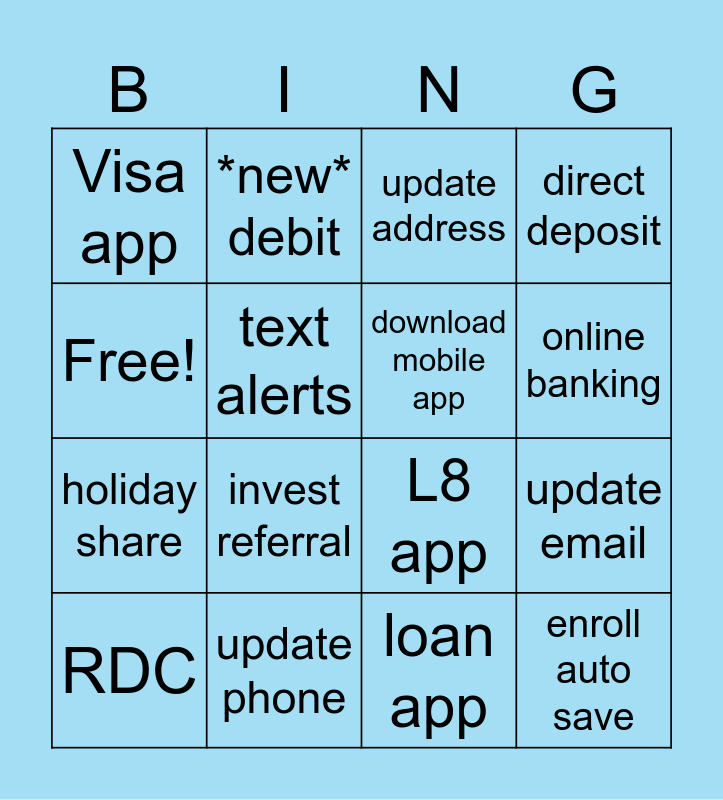 This bingo card has 16 words: update phone, update email, update address, Visa app, holiday share, *new* debit, L8 app, loan app, Free!, text alerts, RDC, direct deposit, invest referral, online banking, download mobile app and enroll auto save.