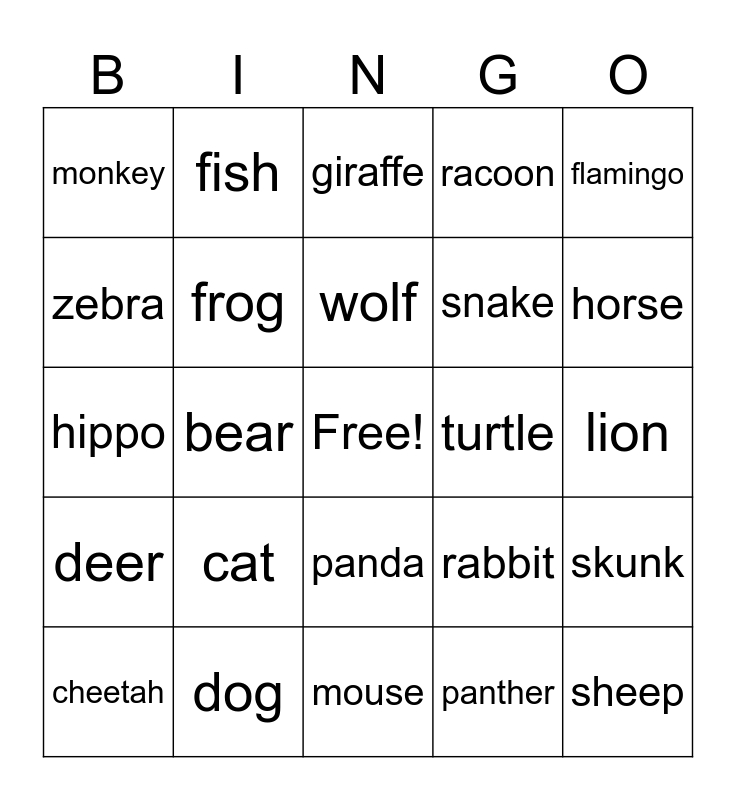 This bingo card has a free space and 24 words: cat, dog, wolf, cheetah, flamingo, monkey, zebra, fish, turtle, panda, snake, hippo, rabbit, skunk, frog, panther, lion, giraffe, horse, bear, sheep, deer, racoon and mouse.