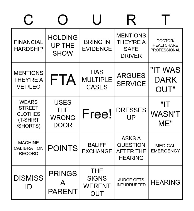 This bingo card has a free space and 29 words: DISMISS ID, ASKS FOR LENIENCY, USES THE WRONG DOOR, DOESNT QUALIFY FOR DDC, FINANCIAL HARDSHIP, BRING IN EVIDENCE, FTA, POINTS, DRESSES UP, PRINGS A PARENT, "IT WASN'T ME", HEARING, THE SIGNS WERENT OUT, JUDGE GETS INTURRUPTED, "IT WAS DARK OUT", JUDGE MENTIONS PIE, BALIFF EXCHANGE, MACHINE CALIBRATION RECORD, DOCTOR/ HEALTCHARE PROFESSIONAL, WEARS STREET CLOTHES (T-SHIRT /SHORTS), ASKS A QUESTION AFTER THE HEARING, INSURANCE RATES, ARGUES SERVICE, MENTIONS THEY'RE A VET/LEO, MENTIONS THEY'RE A SAFE DRIVER, HOLDING UP THE SHOW, MEDICAL EMERGENCY, HAS MULTIPLE CASES and THE SIGNS WERENT THERE WHEN I WENT BACK (MOBILE SITE MOVED).