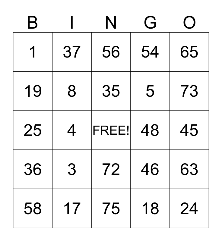 This bingo card has a free space and 24 words: 3, 17, 35, 58, 65, 1, 19, 37, 48, 72, 5, 25, 46, 63, 8, 18, 45, 56, 73, 4, 24, 36, 54 and 75.