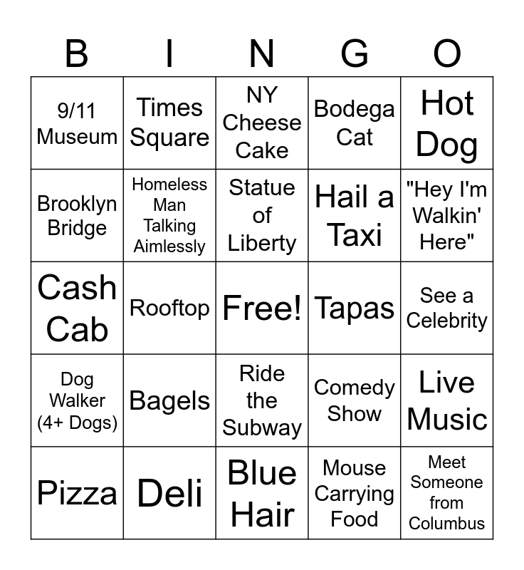 This bingo card has a free space and 24 words: Bagels, Deli, Statue of Liberty, Pizza, Hot Dog, 9/11 Museum, Brooklyn Bridge, Times Square, Tapas, Ride the Subway, Hail a Taxi, Cash Cab, Comedy Show, Live Music, Homeless Man Talking Aimlessly, Mouse Carrying Food, See a Celebrity, NY Cheese Cake, "Hey I'm Walkin' Here", Rooftop, Meet Someone from Columbus, Dog Walker (4+ Dogs), Bodega Cat and Blue Hair.