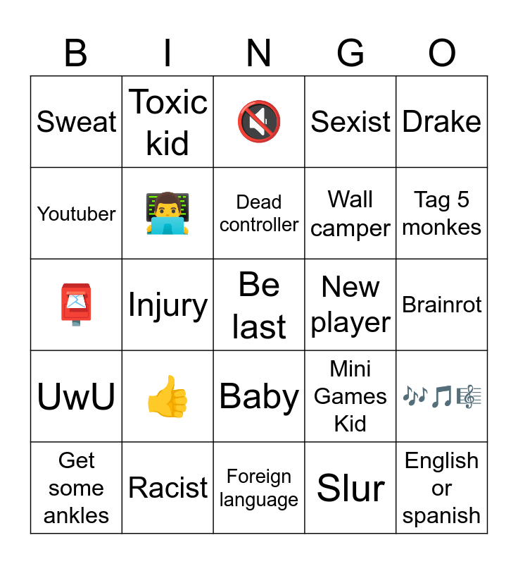 This bingo card has 25 words: 👍, Foreign language, Dead controller, Get some ankles, Drake, Sweat, Youtuber, Toxic kid, New player, Baby, Wall camper, 📮, Mini Games Kid, 🎶🎵🎼, 👨💻, English or spanish, Brainrot, 🔇, Tag 5 monkes, Injury, Be last, Racist, UwU, Sexist and Slur.