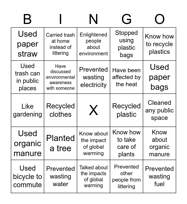 This bingo card has a free space and 24 words: Planted a tree, Prevented wasting water, Prevented wasting electricity, Used bicycle to commute, Know how to recycle plastics, Used paper straw, Used trash can in public places, Carried trash at home instead of littering, Recycled plastic, Know about the impact of global warming, Have been affected by the heat, Like gardening, Know how to take care of plants, Know about organic manure, Have discussed environmental awareness with someone, Prevented other people from littering, Cleaned any public space, Enlightened people about environment, Used paper bags, Recycled clothes, Prevented wasting fuel, Used organic manure, Stopped using plastic bags and Talked about the impacts of global warming.