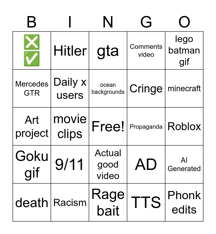 This bingo card has a free space and 24 words: 9/11, Racism, ocean backgrounds, death, lego batman gif, ❎ ✅, Mercedes GTR, Hitler, Propaganda, Actual good video, Cringe, Art project, AD, AI Generated, Daily x users, TTS, Roblox, gta, minecraft, movie clips, Phonk edits, Goku gif, Comments video and Rage bait.