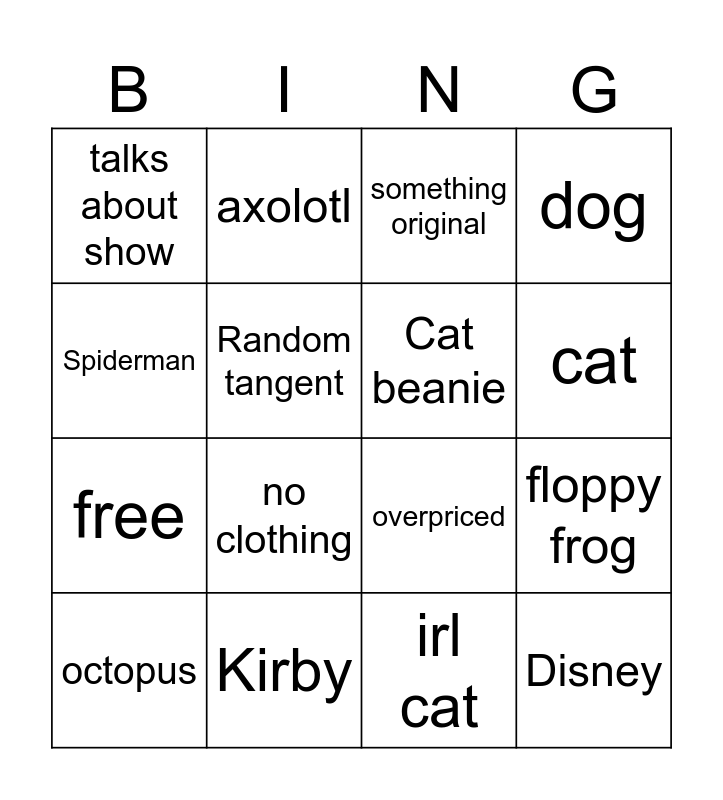 This bingo card has 20 words: floppy frog, bee, something original, mushroom, octopus, Spiderman, Kirby, talks about show, free, axolotl, no clothing, overpriced, Random tangent, Disney, Cat beanie, waits till last minute, cat, dog, irl cat and drawstring bag.