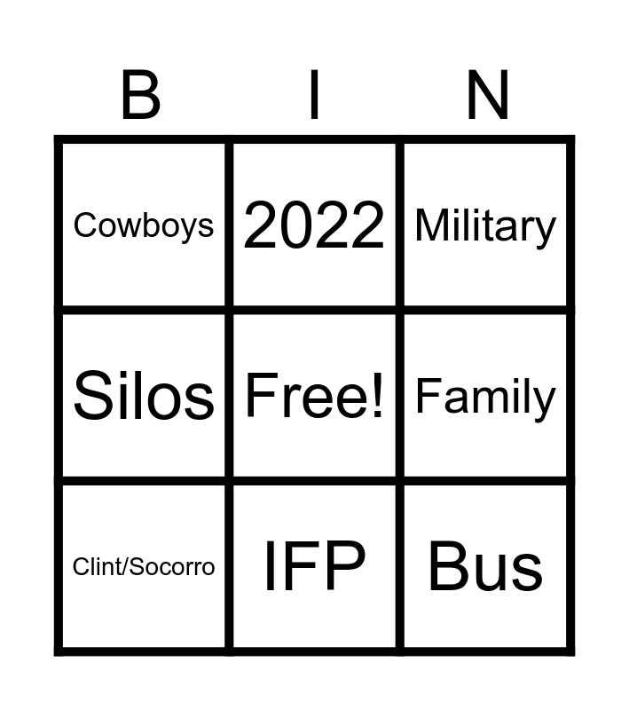 This bingo card has a free space and 8 words: Family, Military, 2022, Clint/Socorro, Cowboys, Bus, Silos and IFP.