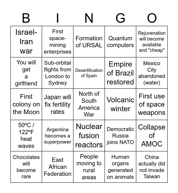 This bingo card has 25 words: Argentina becomes a superpower, People moving to rural areas, Desertification of Spain, Chocolates will become rare, Rejuvenation will become available and "cheap", Israel-Iran war, You will get a girlfriend, First space-mining enterprises, Volcanic winter, Nuclear fusion reactors, Empire of Brazil restored, First colony on the Moon, Democratic Russia joins NATO, Collapse of AMOC, Sub-orbital flights from London to Sydney, China actually did not invade Taiwan, First use of space weapons, Formation of URSAL, Mexico City abandoned (water), Japan will fix fertility rates, North of South America War, East African Federation, 50ºC / 122ºF heat waves, Quantum computers and Human organs generated on animals.