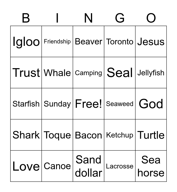 This bingo card has a free space and 34 words: Hockey, Lacrosse, Maple, Fish, Shark, Whale, Jesus, Love, Friendship, Poutine, Camping, Beaver, Octopus, Fire, Seaweed, Jellyfish, Canoe, Starfish, Toque, Ketchup, Bacon, Skiing, Igloo, God, Sand dollar, Sea horse, Toronto, Snow, Seal, Trust, Bible, Sunday, Turtle and Coral.