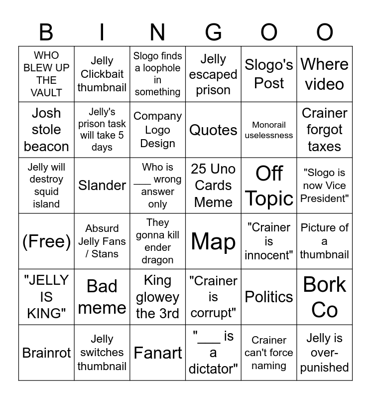 This bingo card has 36 words: "Crainer is corrupt", King glowey the 3rd, "___ is a dictator", Josh stole beacon, (Free), 25 Uno Cards Meme, Jelly's prison task will take 5 days, Fanart, Slogo's Post, Politics, Crainer forgot taxes, Jelly escaped prison, Bork Co, Slander, Quotes, WHO BLEW UP THE VAULT, "JELLY IS KING", Off Topic, Jelly will destroy squid island, Slogo finds a loophole in something, Who is ___ wrong answer only, Absurd Jelly Fans / Stans, Map, They gonna kill ender dragon, "Crainer is innocent", Jelly Clickbait thumbnail, Monorail uselessness, Jelly switches thumbnail, Company Logo Design, Where video, Jelly is over-punished, Brainrot, Picture of a thumbnail, "Slogo is now Vice President", Bad meme and Crainer can't force naming.