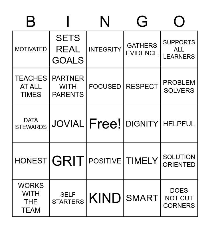This bingo card has a free space and 24 words: GRIT, SELF STARTERS, FOCUSED, WORKS WITH THE TEAM, SUPPORTS ALL LEARNERS, MOTIVATED, TEACHES AT ALL TIMES, SETS REAL GOALS, DIGNITY, POSITIVE, RESPECT, DATA STEWARDS, TIMELY, SOLUTION ORIENTED, PARTNER WITH PARENTS, SMART, HELPFUL, INTEGRITY, PROBLEM SOLVERS, JOVIAL, DOES NOT CUT CORNERS, HONEST, GATHERS EVIDENCE and KIND.