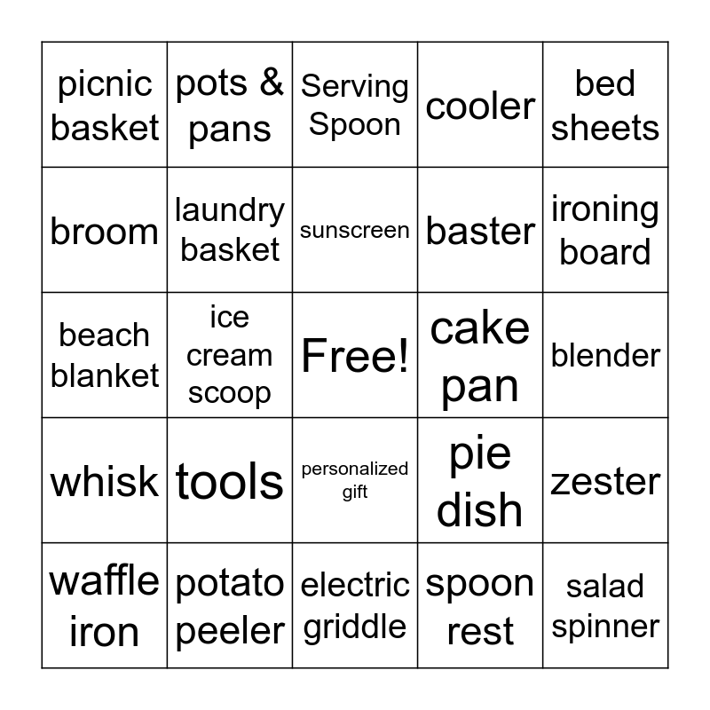 This bingo card has a free space and 81 words: Dinner Plate, Serving Bowl, Serving Spoon, Comforter, Blanket, Towels, Casserole Dishes, Gift Card, measuring cups, measuring spoons, vacuum cleaner, cookie sheets, cooler, picnic basket, pillow, broom, mop, tools, printer, blender, luggage, bed sheets, beach blanket, sunscreen, laundry basket, lamp, blender, ice bucket, crystal vase, iron, ironing board, food storage containers, electric griddle, mixing bowls, waffle iron, cake pan, camping chair, grill, cook book, mixer, salad spinner, ring doorbell, silicone baking mat, spatula, ice cream scoop, zester, pots & pans, frying pan, cutting board, rolling pin, pie dish, zester, clothes dryer, baking rack, tupperware, dressing shaker, chainsaw, lemon squeezer, step stool, mandoline, personalized gift, handmade gift, doormat, cutlery, cupcake/ muffin tin, chip clips, pot holder, trivet, cake tester, can opener, coffee pot, whisk, potato peeler, tongs, potato masher, salad fork, pizza cutter, spoon rest, kitchen towel, baster and blanket.