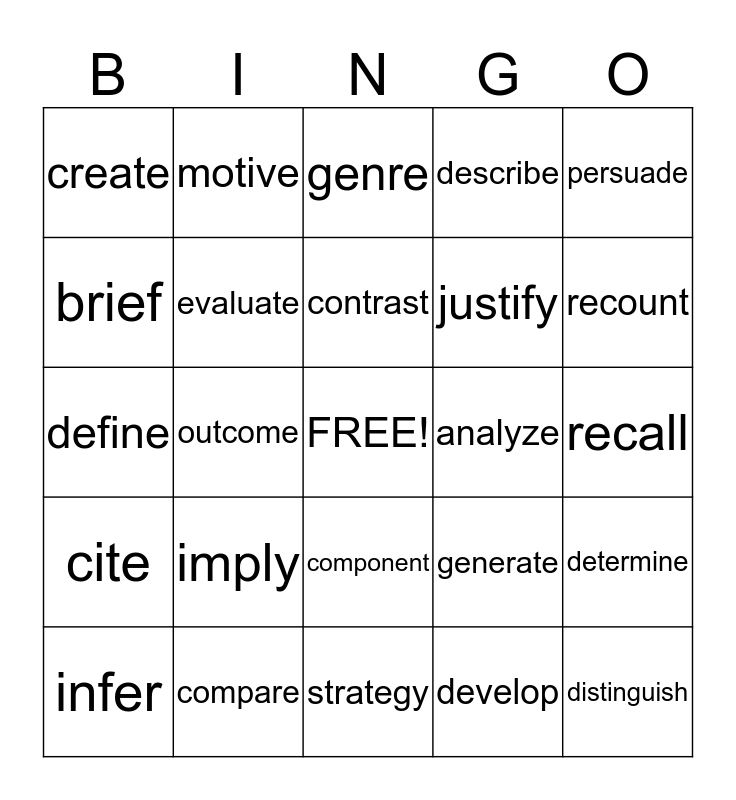 This bingo card has a free space and 24 words: imply, compare, contrast, infer, persuade, create, brief, motive, analyze, component, justify, define, generate, determine, evaluate, develop, recall, genre, recount, outcome, distinguish, cite, describe and strategy.