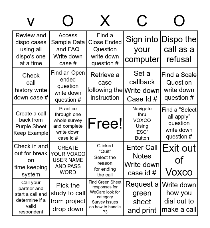 This bingo card has a free space and 24 words: CREATE YOUR VOXCO USER NAME AND PASS WORD, Pick the study to call from project drop down, Retrieve a case following the instruction, Call your partner and start a call and determine if a valid respondent, Dispo the call as a refusal, Review and dispo cases using all dispo's one at a time, Check call history write down case #, Access Sample Data and FAQ Write down case #, Navigate thru VOXCO Using 'ESC" Button, Clicked "Quit" Select the reason for ending the call, Set a callback Write down Case Id #, Create a call back from Purple Sheet Keep Example, Enter Call Notes Write down case id #, Exit out of Voxco, Find an Open ended question write down question #, Request a green sheet and print, Find a "Select all apply" question write down question #, Find a Close Ended Question write down question #, Find a Scale Question write down question #, Practice through one whole survey and complete write down case id #, Write down how you dial out to make a call, Check in and out for break on time keeping system, Sign into your computer and Find Green Sheet responses for WeCare look for category Survey Issues on how to handle P3.