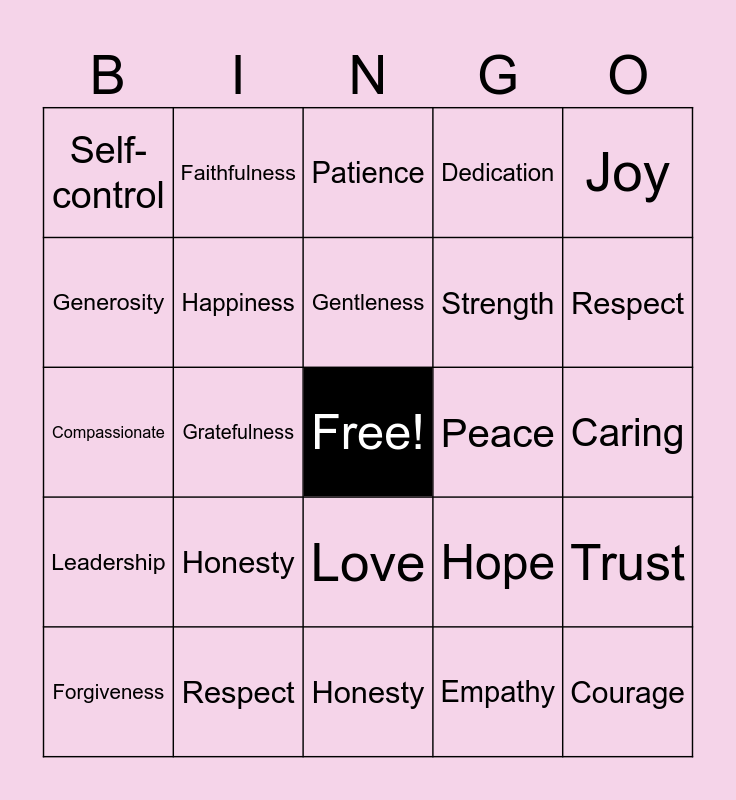 This bingo card has a free space and 24 words: Honesty, Respect, Gentleness, Forgiveness, Joy, Self-control, Generosity, Faithfulness, Peace, Love, Strength, Compassionate, Hope, Trust, Happiness, Empathy, Caring, Patience, Respect, Gratefulness, Courage, Leadership, Dedication and Honesty.