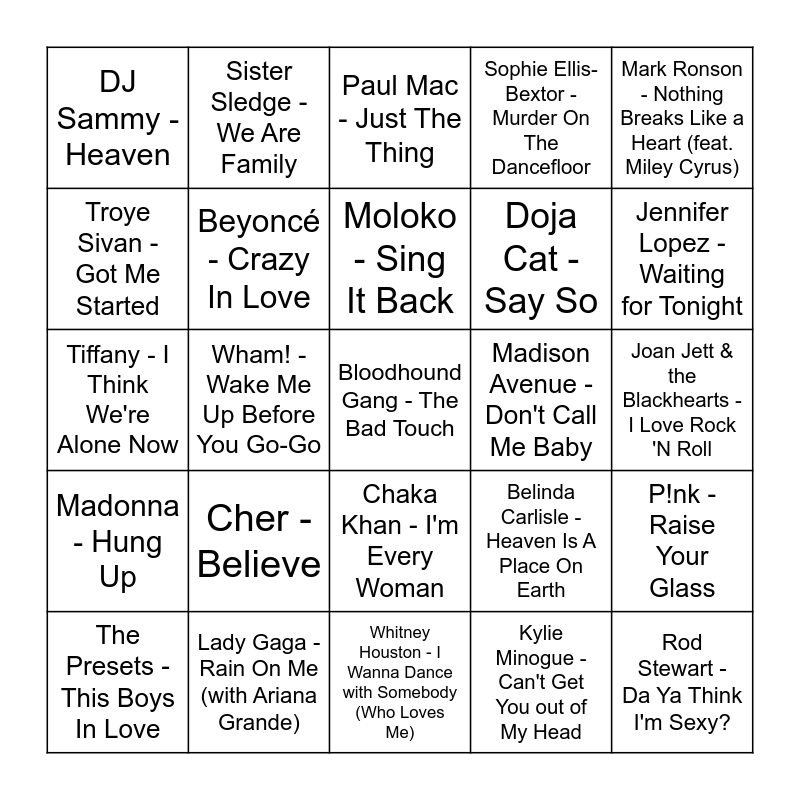 This bingo card has 59 words: Britney Spears - Toxic, Lady Gaga - Rain On Me (with Ariana Grande), Robyn - Dancing On My Own, Madonna - Hung Up, Kylie Minogue - Can't Get You out of My Head, Sabrina Carpenter - Espresso, Beyoncé - Crazy In Love, Dua Lipa - Levitating, Doja Cat - Say So, Rihanna - Don't Stop The Music, Sophie Ellis-Bextor - Murder On The Dancefloor, Dua Lipa - Dance The Night, Troye Sivan - Got Me Started, Ricky Martin - Livin' la Vida Loca, MIKA - Grace Kelly, DJ Sammy - Heaven, Bloodhound Gang - The Bad Touch, Mark Ronson - Nothing Breaks Like a Heart (feat. Miley Cyrus), Florence + The Machine - You've Got The Love, Moloko - Sing It Back, Madison Avenue - Don't Call Me Baby, Paul Mac - Just The Thing, The Presets - This Boys In Love, P!nk - Raise Your Glass, Elton John - Cold Heart - PNAU Remix, Pharrell Williams - Doctor (Work It Out) [feat. Miley Cyrus], G Flip - The Worst Person Alive, ABBA - Voulez-Vous, Jennifer Lopez - Waiting for Tonight, Eurythmics - Sweet Dreams (Are Made of This), Diana Ross - I'm Coming Out, La Bouche - Be My Lover, The Weather Girls - It's Raining Men, Queen - I Want To Break Free, Sister Sledge - We Are Family, CeCe Peniston - Finally, Village People - YMCA, Wham! - Wake Me Up Before You Go-Go, Bee Gees - Night Fever, Tiffany - I Think We're Alone Now, Gloria Gaynor - I Will Survive, Cher - Believe, Joan Jett & the Blackhearts - I Love Rock 'N Roll, Ultra Naté - If You Could Read My Mind, Candi Staton - Young Hearts Run Free, Earth, Wind & Fire - September, Donna Summer - Hot Stuff, Cheryl Lynn - Got to Be Real, Chaka Khan - I'm Every Woman, Whitney Houston - I Wanna Dance with Somebody (Who Loves Me), Tina Turner - The Best, CHIC - Le Freak - 2018 Remaster, Dead Or Alive - You Spin Me Round (Like a Record), Culture Club - Karma Chameleon, Indeep - Last Night a D.J. Saved My Life, Belinda Carlisle - Heaven Is A Place On Earth, Boney M. - Rasputin - Single Version, Rod Stewart - Da Ya Think I'm Sexy? and The Pointer Sisters - I'm So Excited.
