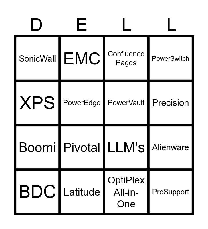 This bingo card has 46 words: Free!, BDC, ADC, TDC, CSG, ISG, EMC, VxRail, PowerEdge, PowerMax, PowerVault, PowerSwitch, PowerStore, PowerProtect, PowerScale, PowerOne, Precision, Latitude, OptiPlex, XPS, Alienware, Wyse, SonicWall, Boomi, VMware, Pivotal, SecureWorks, RSA, Dell Financial Services, ProSupport, Inspiron, Vostro, Precision Mobile Workstation, Alienware Gaming, G Series Gaming, Venue Tablets, OptiPlex All-in-One, UltraSharp Monitors, ProSupport Plus, Gen-AI, Prompt Engineering, Confluence Pages, LLM's, Jira, Atlassian Tools and ERG's.