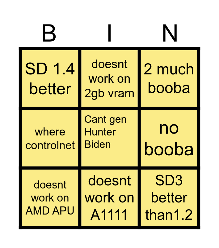 This bingo card has a free space and 8 words: no booba, 2 much booba, doesnt work on 2gb vram, doesnt work on AMD APU, SD 1.4 better, SD3 better than1.2, where controlnet and doesnt work on A1111.