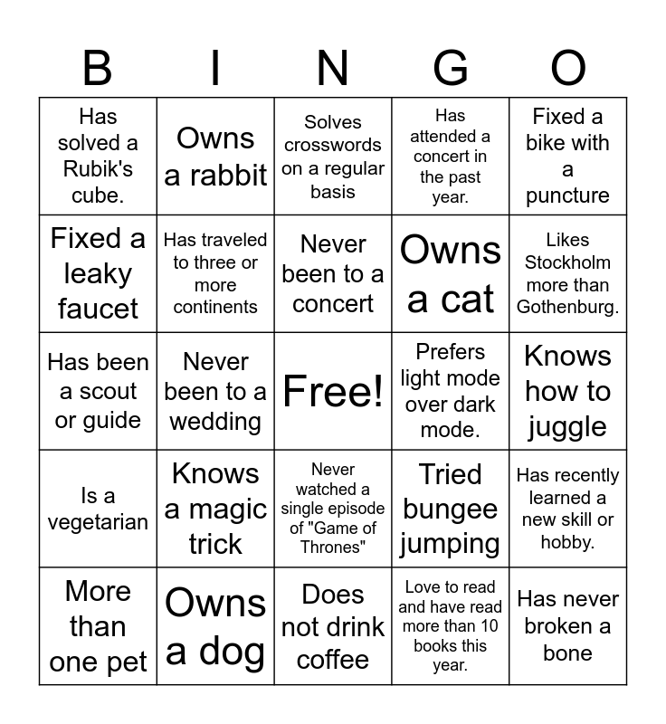 This bingo card has a free space and 92 words: Woke up before 6am today, Never been on an airplane, Does not drink coffee, Has zero unread emails, Subscribed to five or more streaming sites, Been to Spain, Has broken more than one bone, More than one pet, Still uses a phone with buttons, Never finished a book, Visited China, Can speak four or more languages, Broken a phone within one month of owning it, Owns a cat, Likes pineapple on pizza, Fixed a bike with a puncture, Solves crosswords on a regular basis, Released music on Spotify, Never left Europe, Does not use opera as their web browser, Been skydiving, Been in the military, Is vegan, Has a family recipe, Knows a magic trick, Has traveled to three or more continents, Has never been to the beach, Does not have a social media account, Has been to Japan, Has run a marathon, Owns a dog, Never watched a single episode of "Game of Thrones", Visited South America, Can play a musical instrument, Owns a rabbit, Likes anchovies on pizza, Fixed a car problem by themselves, Published a book or article, Never been to a concert, Tried bungee jumping, Has been a scout or guide, Is a vegetarian, Knows how to juggle, Speaks three languages fluently, Has never broken a bone, Owns a motorcycle, Has completed a triathlon, Has been to Antarctica, Collects vinyl records, Never uses public transportation, Can do a handstand, Has a tattoo, Has lived in more than three countries, Has a YouTube channel, Never eaten sushi, Owns a reptile, Likes to paint or draw, Fixed a leaky faucet, Practices yoga daily, Never been to a wedding, Does not use Facebook, Has gone scuba diving, Has been a mentor, Has worked at Opera for over 5 years., Plays a musical instrument., Love to read and have read more than 10 books this year., Has been skydiving or bungee jumping., Is left-handed., Loves to garden or grow plants., Is an only child., Has met a celebrity., Can do a great impression of someone famous., Has attended a concert in the past year., Prefers tea over coffee., Has a nickname they like to be called., Knows how to juggle., Has recently learned a new skill or hobby., Has contributed to an open-source project., Can code in more than three programming languages., Has attended a tech conference in the past year., Has built a personal website or blog., Prefers light mode over dark mode., Has solved a Rubik's cube., Uses a mechanical keyboard., Has set up a home server or smart home system., Can touch type without looking at the keyboard., Has a dual monitor setup at home., Enjoys playing video games., Prefers Linux over other operating systems., Prefers working late at night over early mornings., Likes Stockholm more than Gothenburg. and Has been fined by a ticket inspector.