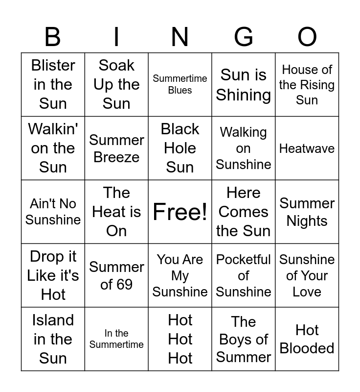 This bingo card has a free space and 24 words: Summer of 69, In the Summertime, Black Hole Sun, Island in the Sun, House of the Rising Sun, Blister in the Sun, Walkin' on the Sun, Soak Up the Sun, Here Comes the Sun, You Are My Sunshine, Walking on Sunshine, Ain't No Sunshine, Pocketful of Sunshine, Sunshine of Your Love, Summer Breeze, The Boys of Summer, Summer Nights, Summertime Blues, Heatwave, The Heat is On, Hot Blooded, Drop it Like it's Hot, Sun is Shining and Hot Hot Hot.