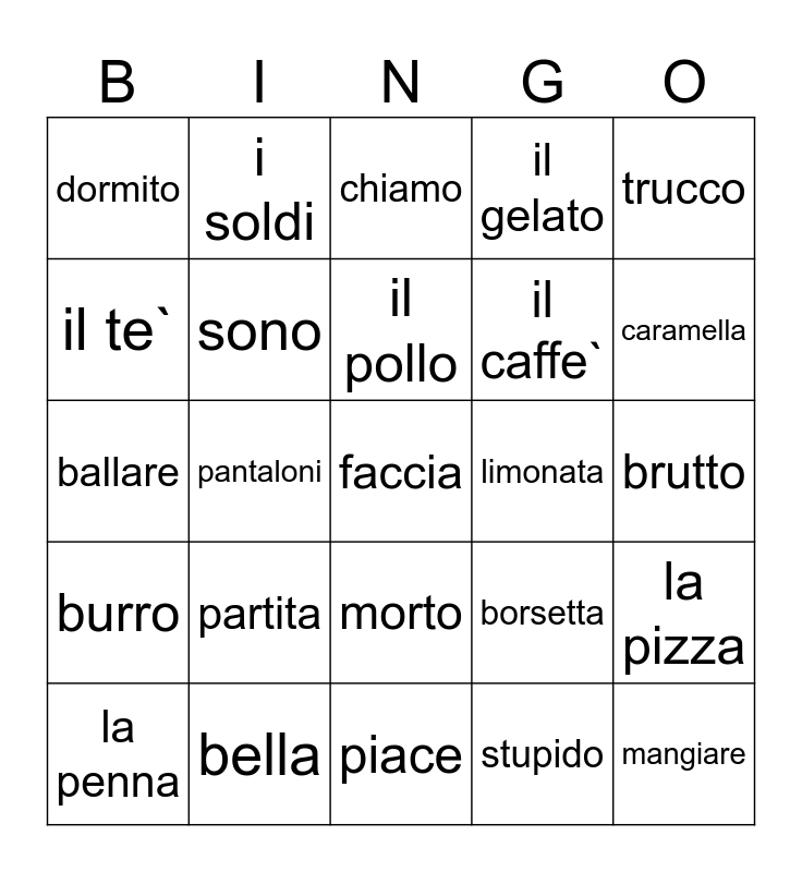 This bingo card has 30 words: bella, cibo, pantaloni, caviglia, dormito, chiamo, sono, morto, limonata, piace, brutto, faccia, stupido, mangiare, caramella, biscotti, borsetta, burro, partita, trucco, ballare, cantare, i soldi, il caffe`, il te`, il gelato, la pizza, la penna, il pollo and la pasta.