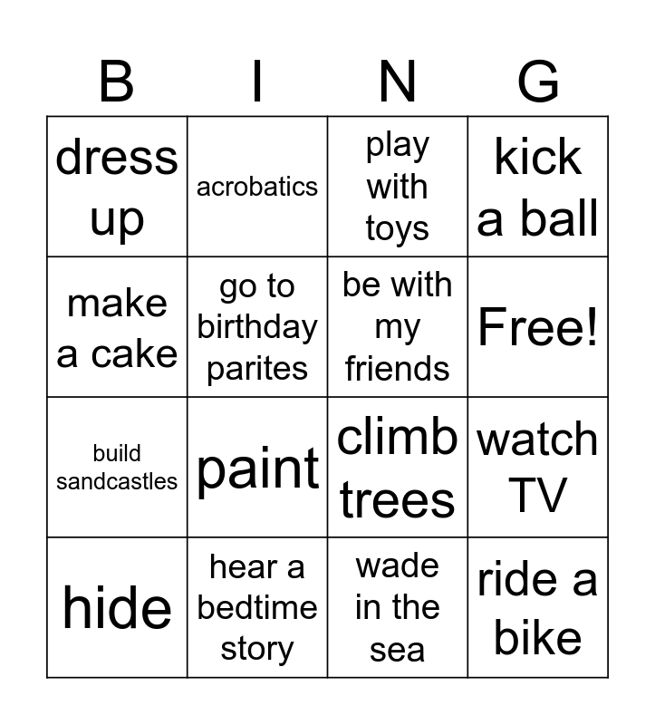 This bingo card has 18 words: paint, ride a bike, play with toys, dress up, climb trees, kick a ball, hide, acrobatics, Free!, build sandcastles, wade in the sea, make a cake, watch TV, go to birthday parites, be with my friends, have a bath, hear a bedtime story and dream.