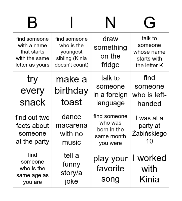 This bingo card has 16 words: tell a funny story/a joke, I was at a party at Żabińskiego 10, draw something on the fridge, find someone with a name that starts with the same letter as yours, find out two facts about someone at the party, find someone who is the youngest sibling (Kinia doesn't count), find someone who was born in the same month you were, play your favorite song, try every snack, make a birthday toast, find someone who is the same age as you are, talk to someone whose name starts with the letter K, dance macarena with no music, find someone who is left-handed, talk to someone in a foreign language and I worked with Kinia.