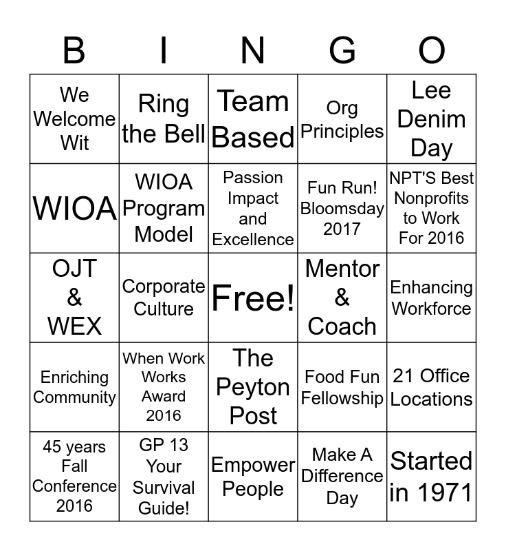 This bingo card has a free space and 24 words: When Work Works Award 2016, GP 13 Your Survival Guide!, Passion Impact and Excellence, 45 years Fall Conference 2016, Lee Denim Day, We Welcome Wit, WIOA, Ring the Bell, Mentor & Coach, The Peyton Post, Fun Run! Bloomsday 2017, OJT & WEX, Food Fun Fellowship, 21 Office Locations, WIOA Program Model, Make A Difference Day, Enhancing Workforce, Team Based, NPT'S Best Nonprofits to Work For 2016, Corporate Culture, Started in 1971, Enriching Community, Org Principles and Empower People.