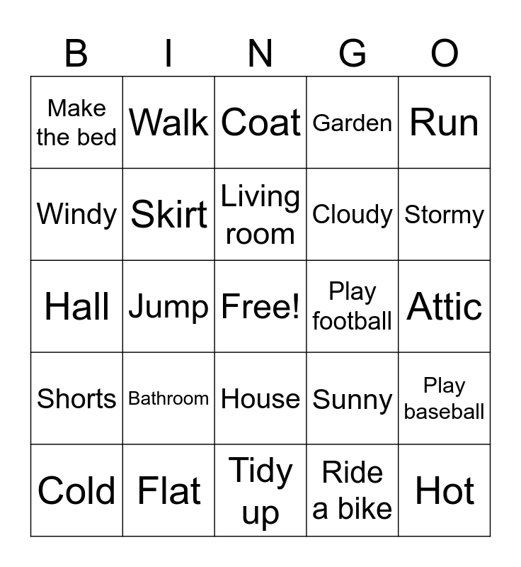 This bingo card has a free space and 24 words: Bathroom, Flat, Living room, Cold, Run, Make the bed, Windy, Walk, Play football, House, Cloudy, Hall, Sunny, Play baseball, Skirt, Ride a bike, Attic, Coat, Stormy, Jump, Hot, Shorts, Garden and Tidy up.
