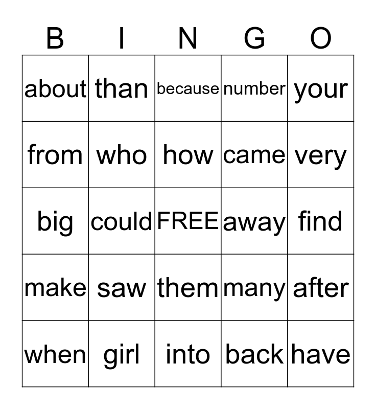 This bingo card has a free space and 24 words: saw, girl, how, when, your, about, from, than, away, them, came, big, many, after, who, back, find, because, very, could, have, make, number and into.