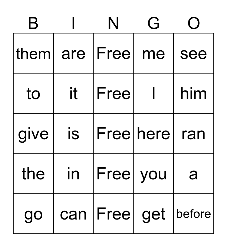 This bingo card has a free space and 24 words: go, in, Free, get, see, them, are, Free, here, ran, give, it, you, a, to, can, Free, me, him, the, is, Free, I and before.