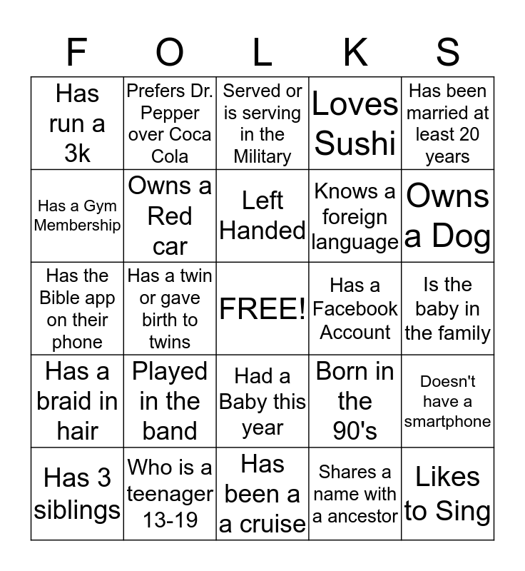 This bingo card has a free space and 24 words: Played in the band, Who is a teenager 13-19, Left Handed, Has 3 siblings, Has been married at least 20 years, Has run a 3k, Has a Gym Membership, Prefers Dr. Pepper over Coca Cola, Has a Facebook Account, Had a Baby this year, Knows a foreign language, Has the Bible app on their phone, Born in the 90's, Doesn't have a smartphone, Owns a Red car, Shares a name with a ancestor, Is the baby in the family, Served or is serving in the Military, Owns a Dog, Has a twin or gave birth to twins, Likes to Sing, Has a braid in hair, Loves Sushi and Has been a a cruise.