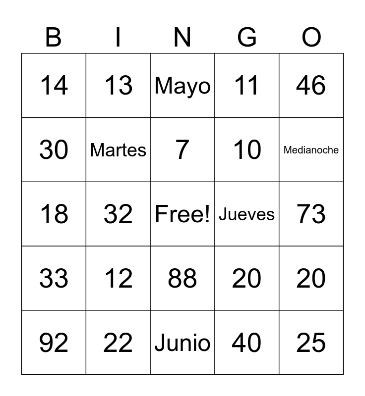 This bingo card has a free space and 66 words: 75, 77, 38, 20, 21, 16, 13, 8, 7, 36, 88, 79, 73, 46, 47, 30, 32, 14, 13, 10, 12, 33, 11, 29, 6, 63, 66, 74, 25, 99, 92, 55, 35, 1, 20, 22, 27, 18, 40, Lunes, Martes, Miércoles, Jueves, Viernes, Sábado, Domingo, Medianoche, Mediodía, Al lado (de), Debajo (de), Detrás (de), Enfrente (de), Entre, Sobre, Enero, Febrero, Marzo, Abril, Mayo, Junio, Julio, Agosto, Septiembre, Octubre, Noviembre and Diciembre.