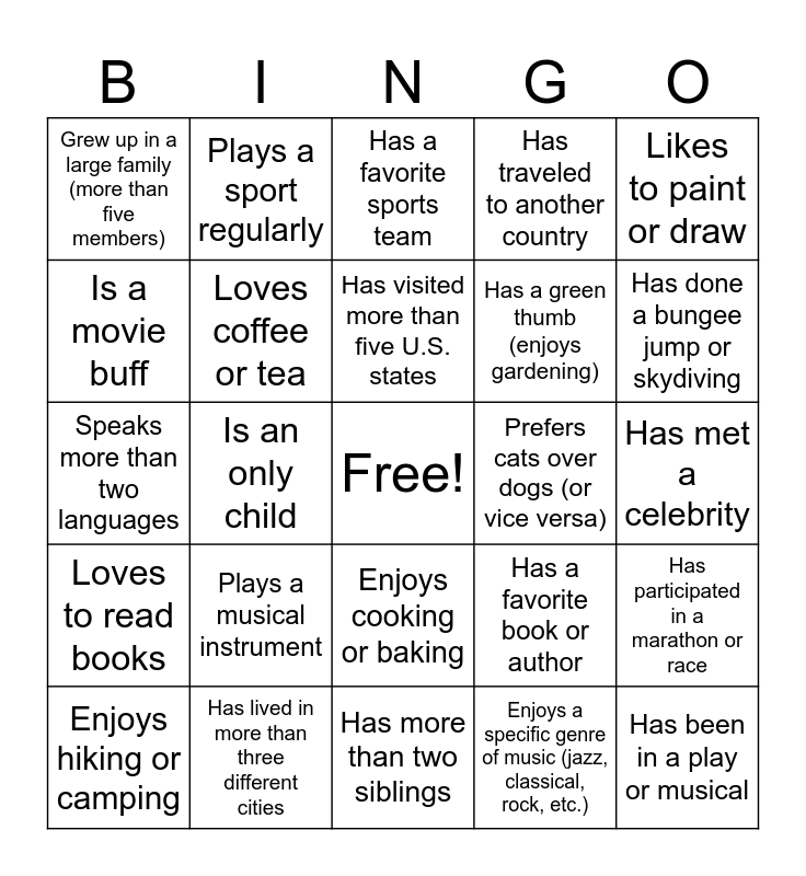 This bingo card has a free space and 31 words: Has more than two siblings, Has a pet other than a cat or dog, Is an only child, Has twins or multiples in the family, Grew up in a large family (more than five members), Has a favorite sports team, Loves coffee or tea, Has a favorite book or author, Prefers cats over dogs (or vice versa), Enjoys a specific genre of music (jazz, classical, rock, etc.), Has met a celebrity, Has been in a play or musical, Has volunteered in the community, Has worked at a summer camp before, Has done a bungee jump or skydiving, Has been on a cruise, Has participated in a marathon or race, Plays a musical instrument, Loves to read books, Enjoys cooking or baking, Likes to paint or draw, Collects something unique (coins, stamps, etc.), Enjoys hiking or camping, Plays a sport regularly, Has a green thumb (enjoys gardening), Is a movie buff, Has traveled to another country, Speaks more than two languages, Has lived in more than three different cities, Has visited more than five U.S. states and Has family living in another country.